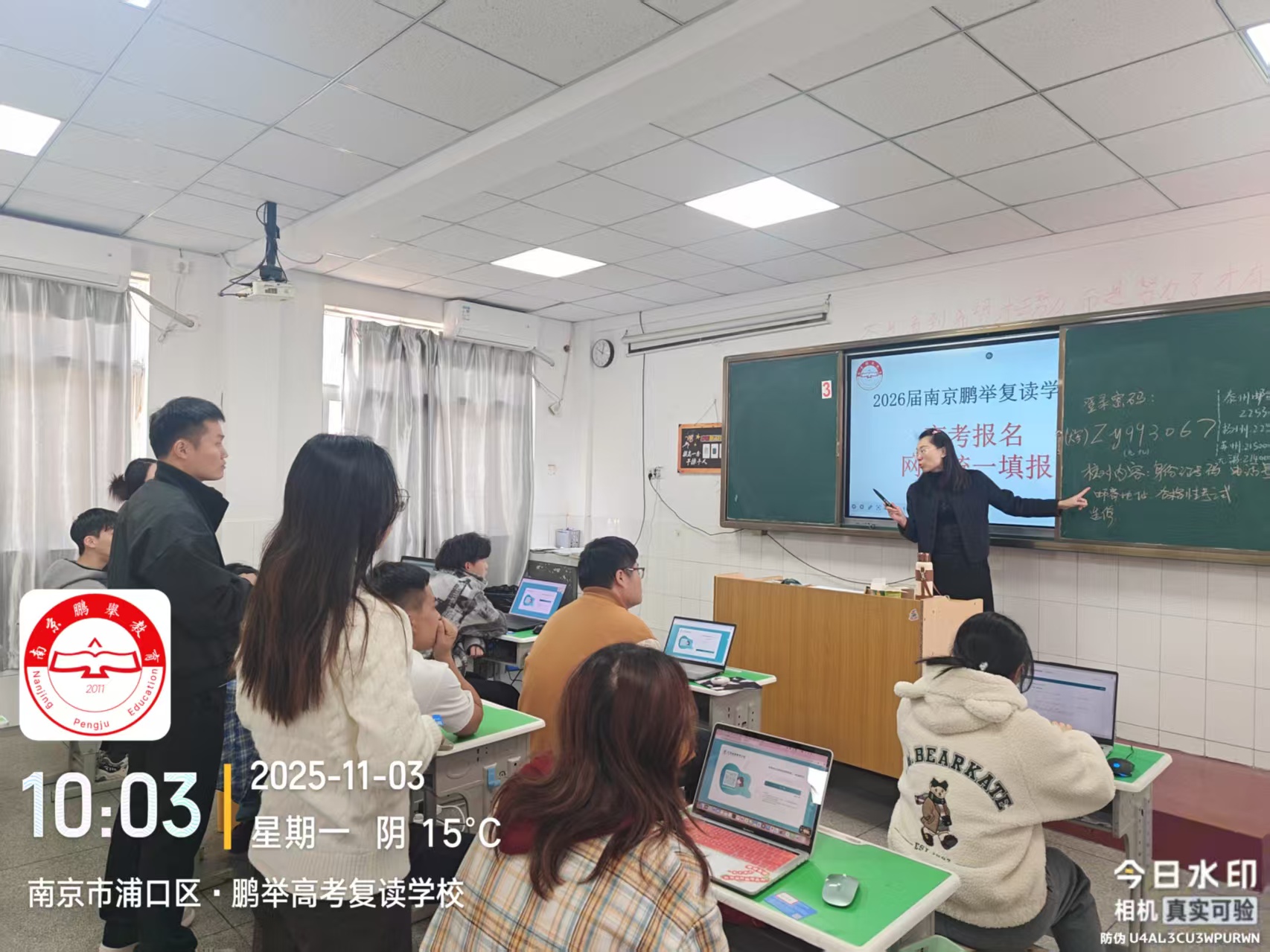 11月3日,2026年江苏省高考网上报名正式开启。为确保每一位考生信息准确、流程顺畅、绝不漏报错报,南京鹏举高考复读学校统一组织、集中安排,由班主任全程陪同,一对一现场指导、逐项核对、反复审核,圆满完成全体学生高考报名工作。