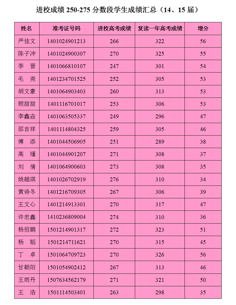 以下是2014年、2015年鹏举高复进校成绩在250至275分之间的学生高考成绩