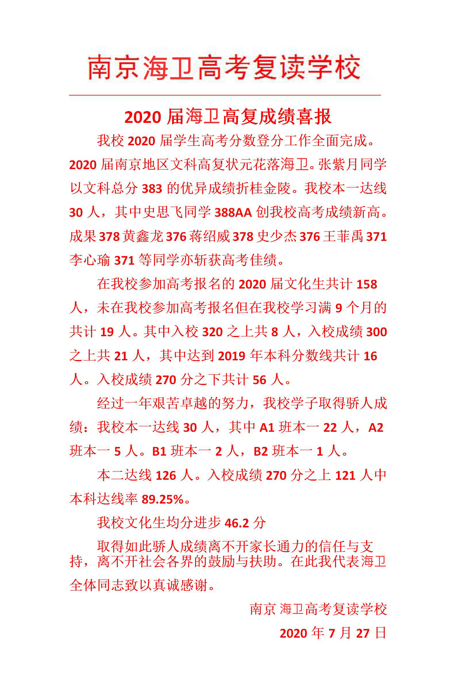 热烈庆祝2020届南京高复文科状元花落鹏举